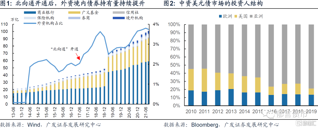 “北向通”開通後,外資持有境內債體量快速增長。2017年7月,中國人民銀行與香港金融管理局曾聯合各部門共同推出了“北向通”,促進境外投資者投資內地銀行間債券市場。根據央行9月15日答記者問中的披露,“北向通”開通前,境外投資者持有我國債券約為8500億元人民幣。目前這一規模已經達到3.8萬億元人民幣(佔全市場比重3.74%)。其中,“北向通”的境外投資者持債規模約1.1萬億元人民幣,成為外資投資境內債券市場的重要渠道。