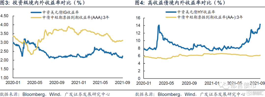 中資美元債投資級的收益率普遍低於境內債,而高收益債較境內債有明顯溢價。對於中資美元債,我們觀察彭博中資美元債投資級(IG)和高收益債(HY)曲線,對於境內債,採用中短期票據到期收益率AAA:3Y代表投資級,採用中短期票據到期收益率AA-:3Y代表高收益,分別對比二者價差。截至2021年9月17日,境外投資級收益率水平整體低於境內3Y AAA 89bp;9月由於高收益市場暴跌,境外高收益債收益率水平整體高於境內3Y AA- 814bp,較8月末的591bp大幅走闊。