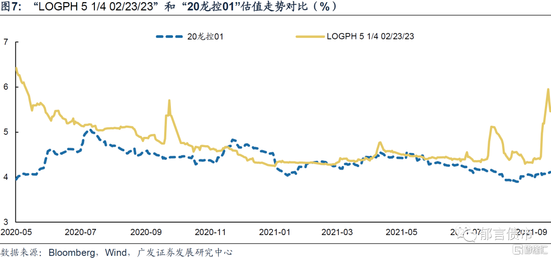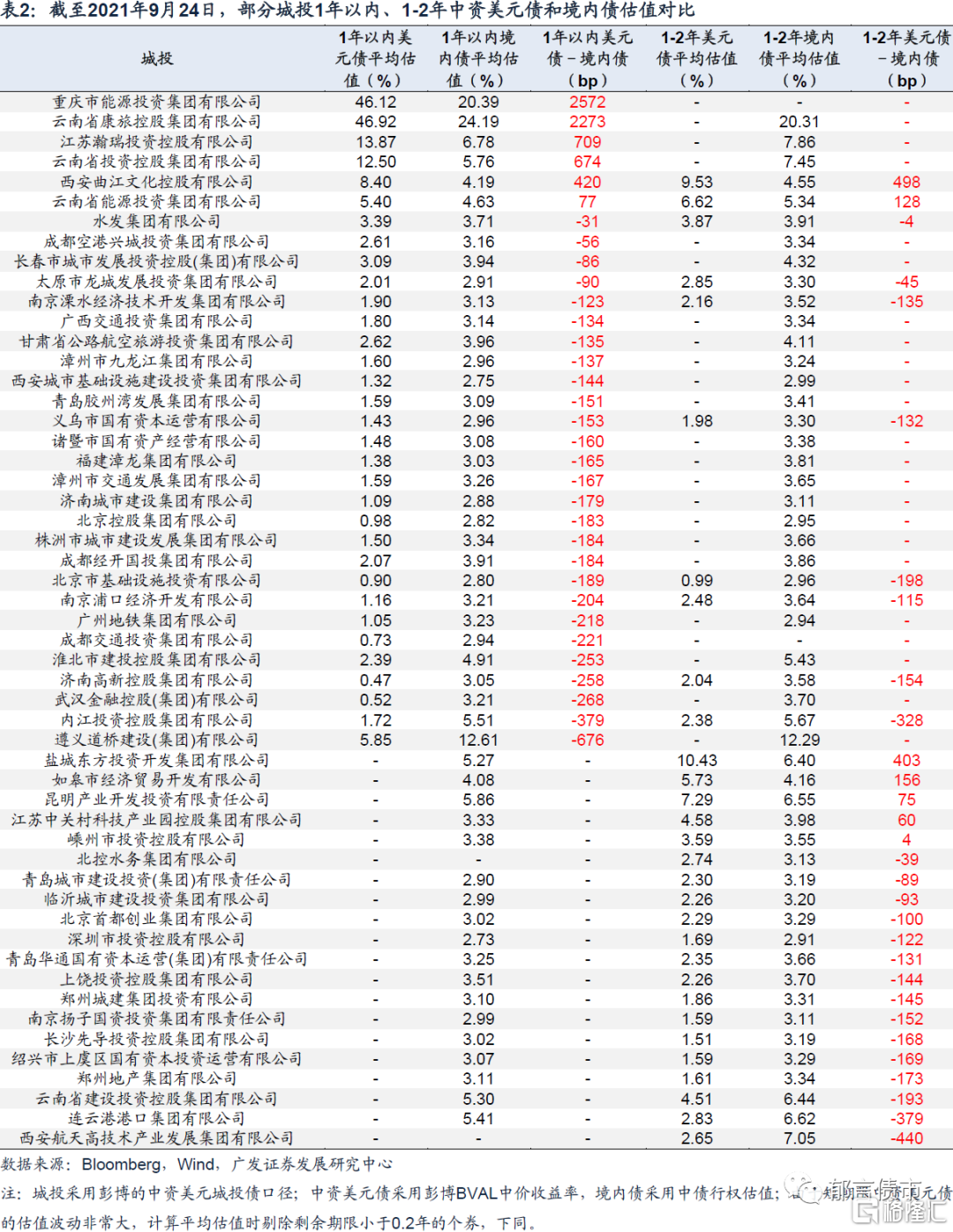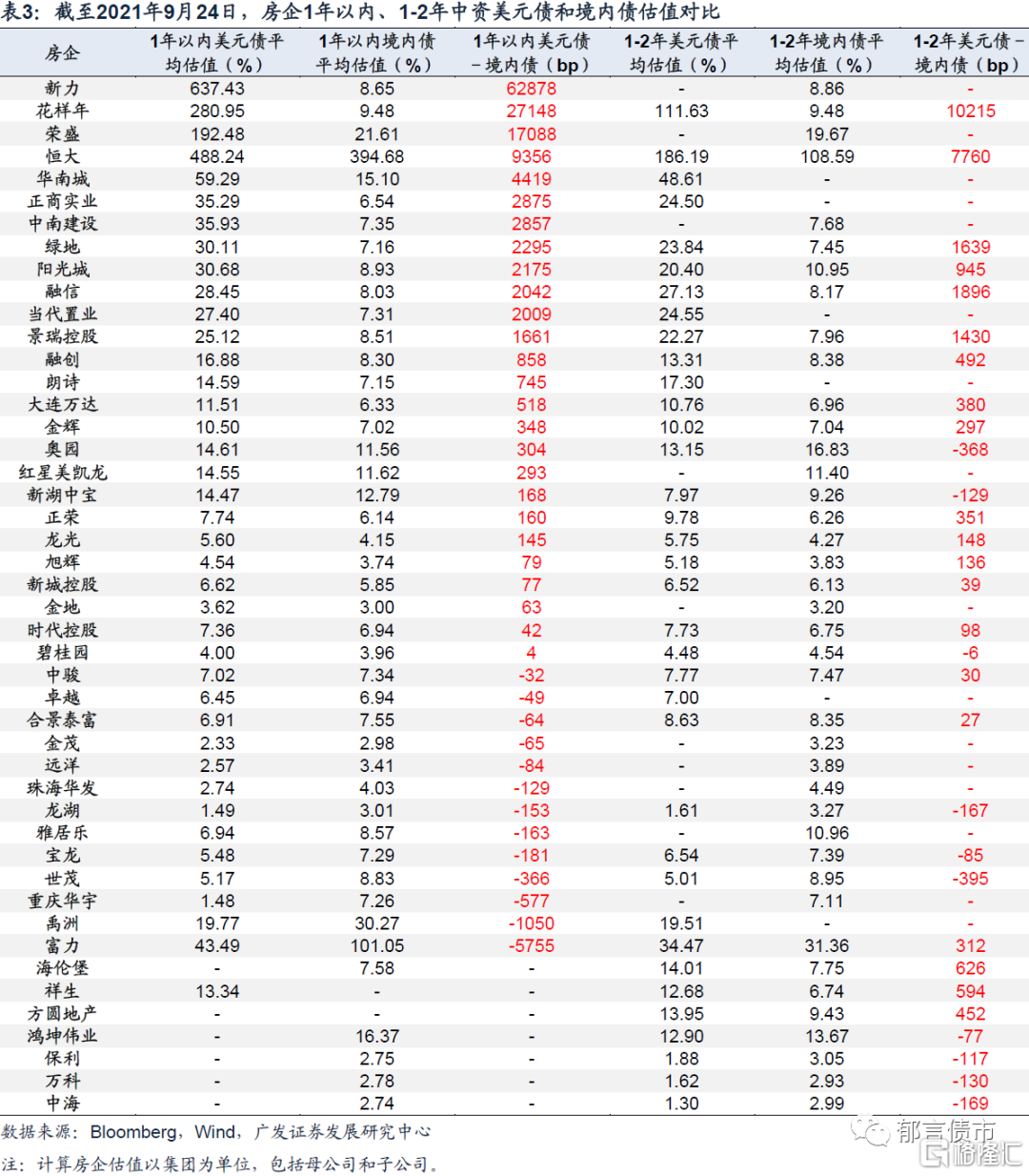 從結果來看,城投中資美元債收益率高於境內債的佔比相對較低,而房企中資美元債高於境內債的佔比較高。表2羅列了美元債餘額超過3億美元(不含3億美元),且1年以內或1-2年境內外債券有價差的城投(採用彭博的中資美元城投債口徑),美元債相比境內債有明顯溢價的主要包括雲南3家城投、重慶能源集團、江蘇瑞瀚投資、西安曲江文化等。表3羅列了1年以內或1-2年境內外債券有價差的房企,多數高收益房企的中資美元債收益率高於境內債,新力、花樣年、榮盛和恆大1年以內債券的價差超過9%。