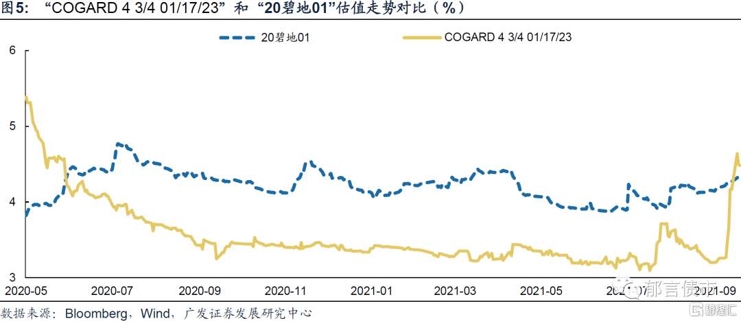 動態來看,部分基本面良好的房企出現超跌。2021年9月,受恆大危機事件以及多家房企被境外評級機構下調評級的影響,地產美元債出現暴跌,也拖累了一些基本面良好的房企。我們觀察剩餘期限相差較小的境內債和中資美元債估值走勢。