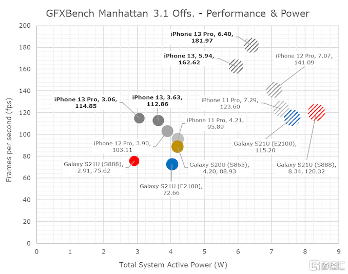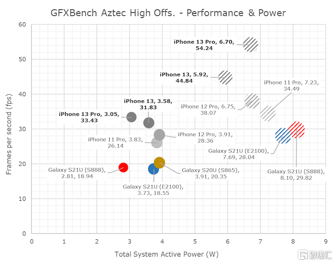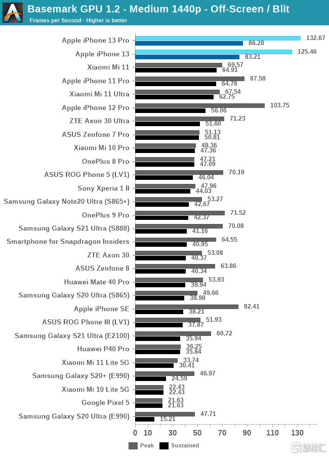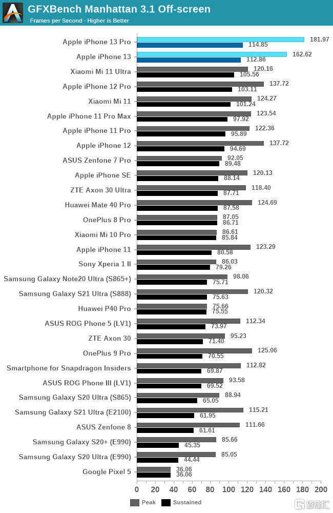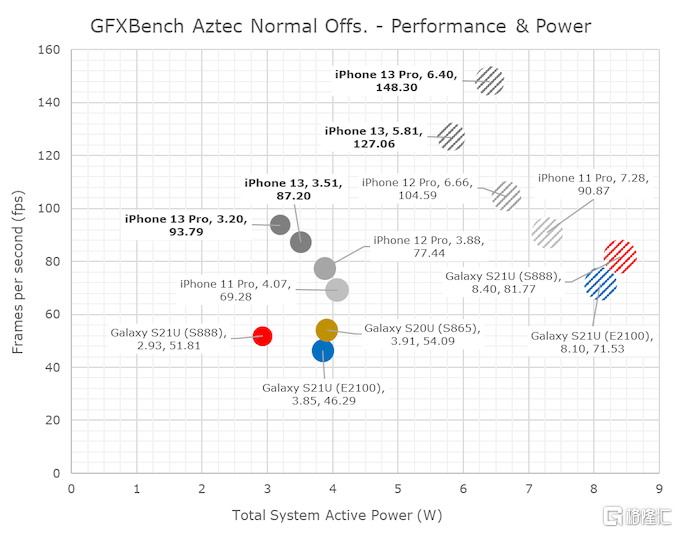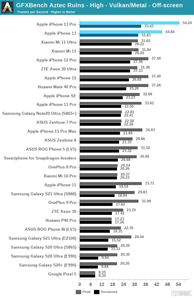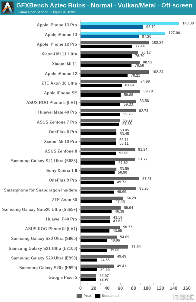 在 Aztec Normal 中,我們在性能和效率方面看到了類似的相對定位。由於節流級別不同,iPhone 13 和 13 Pro 的性能比預期的要接近得多。
