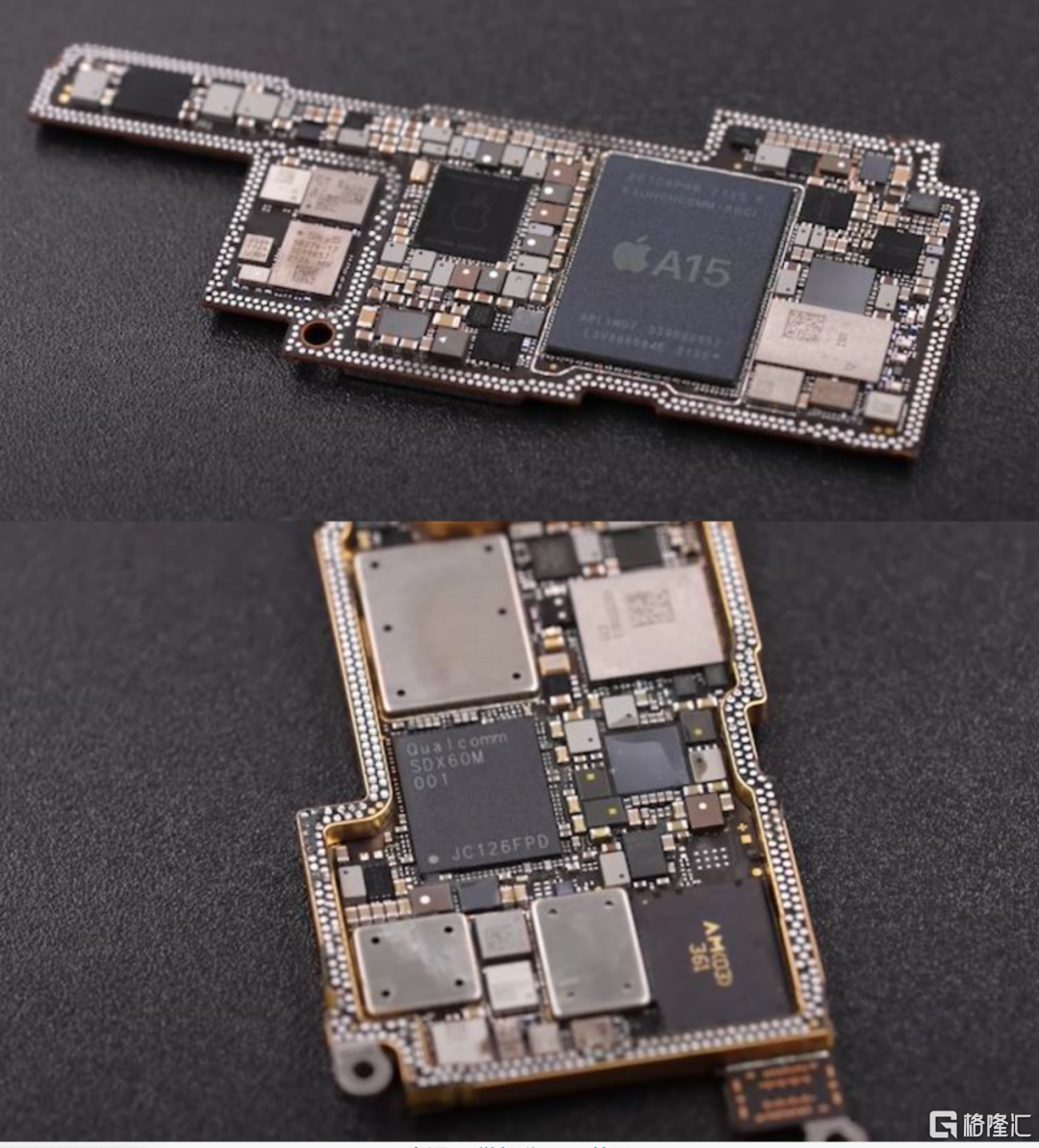 今年的 13 Pro 機型採用了新的 PCB 設計,其密度甚至比我們前幾代的還要高,以便於使用更大的電池和新的相機模塊。Apple的主板設計非常令人困惑的是,由於他們採用了雙層“三明治”PCB,因此他們將 SoC 封裝在兩個焊接板的內部。這與三星等其他供應商形成鮮明對比,他們也採用了“三明治”PCB,但 SoC 位於組件的外側,與散熱器和顯示器中框直接接觸。