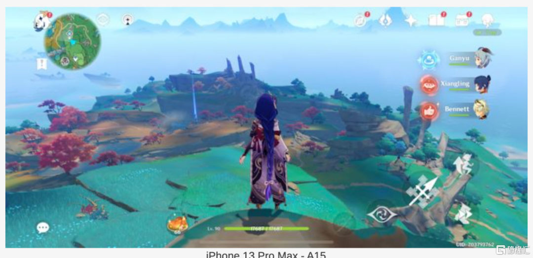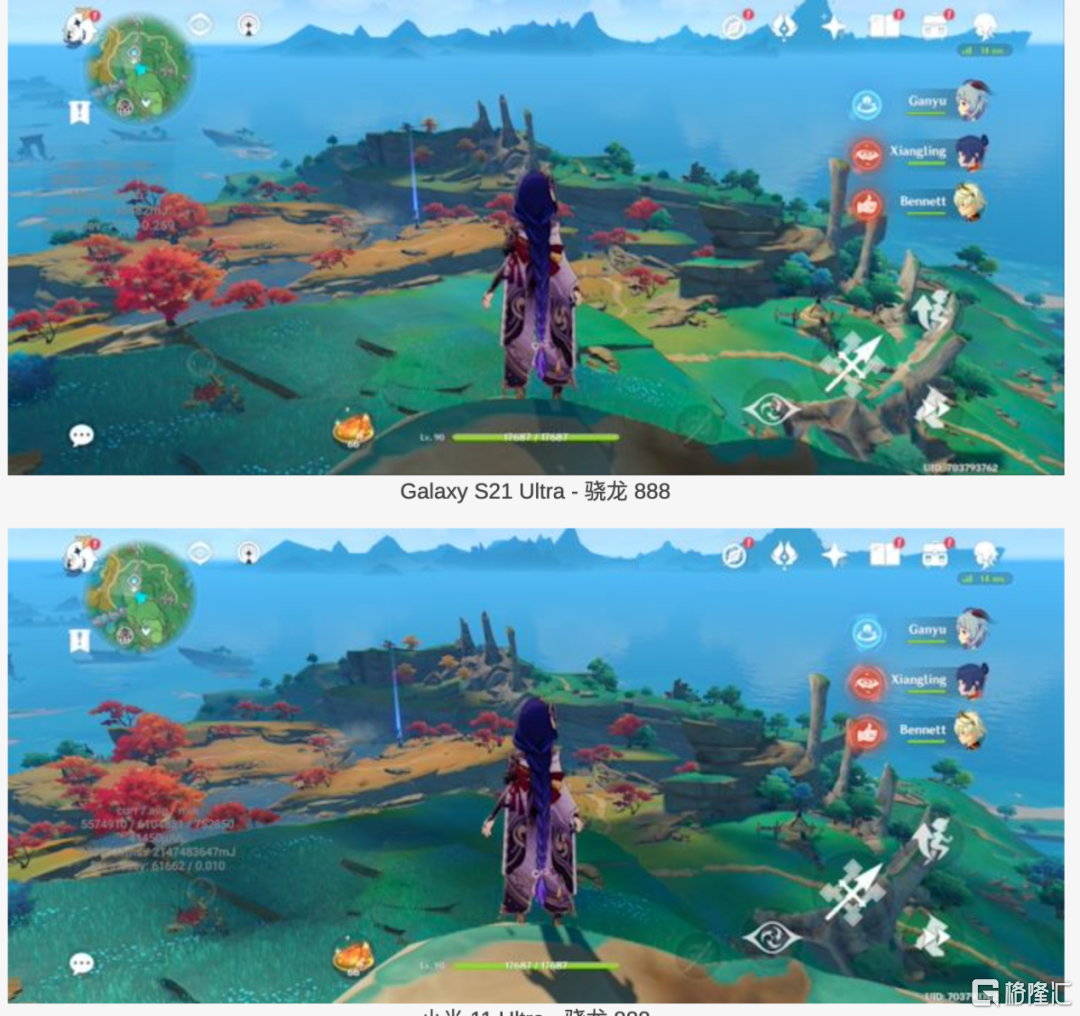 以 Genshin Impact 爲例,它無疑是目前排名第一的 AAA 手機遊戲,也是目前市場上對性能要求最高的遊戲之一,比較 Galaxy S21Ultra(Snapdragon 888)、Mi 11Ultra 和 iPhone 13 Pro Max的視覺保真度。: