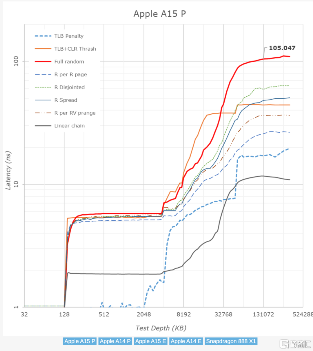 Apple 沒有透露的是,性能核心的 L2 緩存也發生了變化,現在已經從 8MB 增加到 12MB,增長了 50%。這實際上與 Apple M1 上的 L2 大小相同,只是這一次它只提供兩個性能核心而不是四個。訪問延遲似乎從 A14 上的 16 個週期上升到 A15 上的 18 個週期。在性能核心上,我還看到 L1 速度的一些變化,因爲它似乎能夠對緩存行進行 1 週期訪問,只要它們在同一頁面中,在 A14 上進行相同類型的訪問需要 3 個週期。