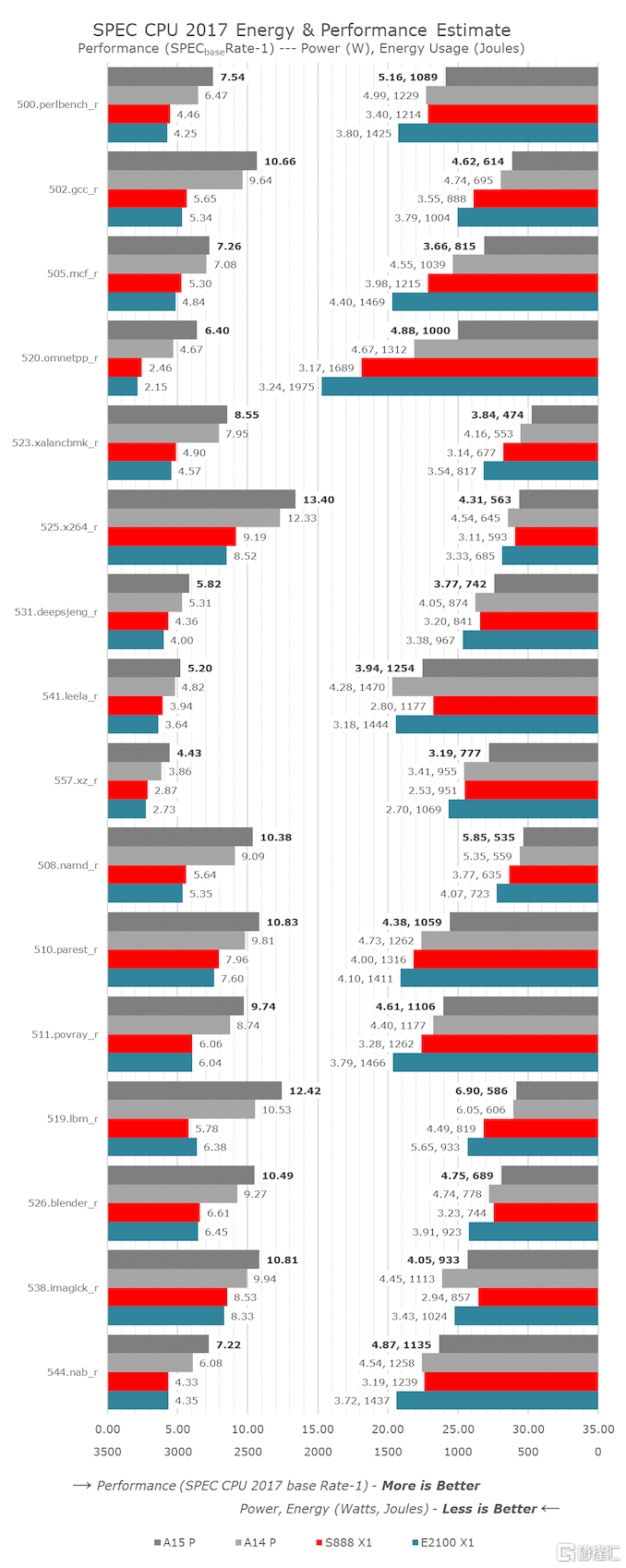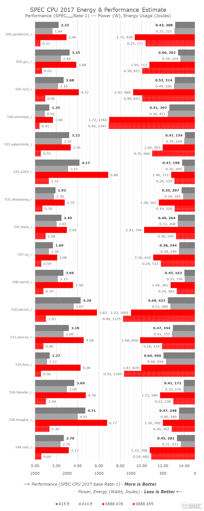 最耗電的工作負載 519.lbm_r 非常耗帶寬,並且在套件中對 DRAM 的壓力最大,這裏的 A15 芯片消耗了高達 6.9W 的功耗。儘管如此,隨着性能提升 17.9%,能效在代際上略有提高——根據第一次拆解報告,A15 仍然僅採用 LPDDR4X 級內存,因此這些改進必須歸功於芯片的新內存子系統和新 SLC。