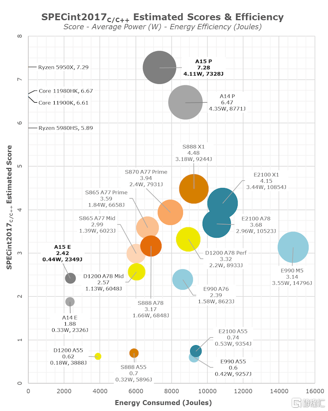 在概覽圖中,我也稍微改變了一些東西,轉向氣泡圖,以更好地在空間上表示能效定位的性能,以及功率定位的性能。在我個人認爲更能代表 SoC 的比較效率和由此產生的電池壽命體驗的能量軸圖中,我們看到了處於峯值 CPU 性能狀態的各種 SoC 與完成工作負載消耗的總能量的對比。在功耗軸圖上,我們看到相同的數據,只是針對平均功耗繪製的。一般來說,我發現不同數據點之間的功耗差異相當困難,但是有些讀者要求這種觀點。氣泡大小對應於各個 CPU 的平均功率,我們測量的是系統有功功率,