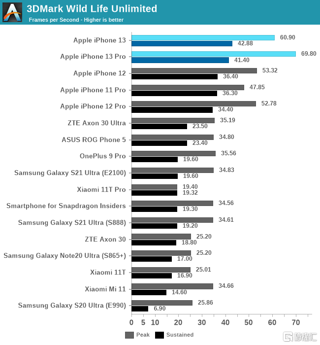 在 3DMark Wild Life 測試中,我們看到 5 核 A15 比 A15 高出 +30%,而 4 核的性能提升了+14%,非常接近我們的預測。這裏的峯值性能基本上是最接近的競爭對手的兩倍,因此蘋果可能會再次低頭。