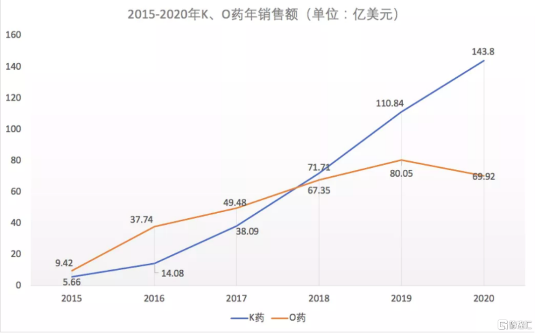 在2020年O藥因疫情影響臨牀試驗遇阻的情況下,K藥依然在“攻城略地”。兩者的差距也在2020年被逐漸拉開。回看過去,2016年O藥銷售額幾乎是K藥的3倍;到了2020年,K藥的銷售額接近150億美元,接近O藥的2倍。但K藥如今的領先優勢,遠大於曾經的O藥。