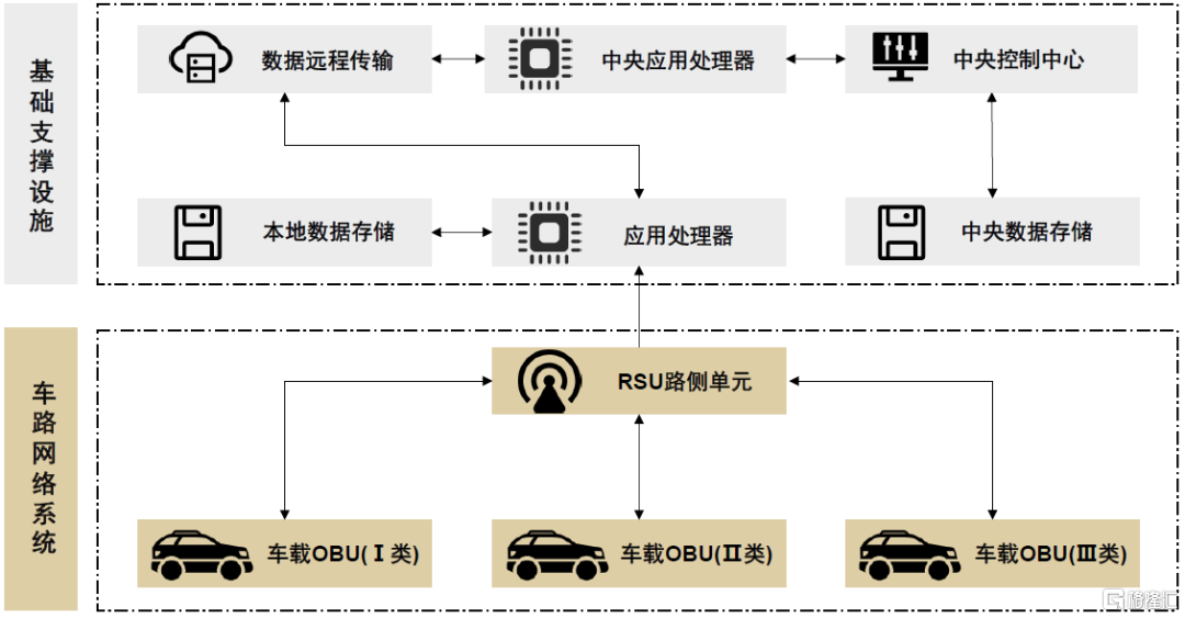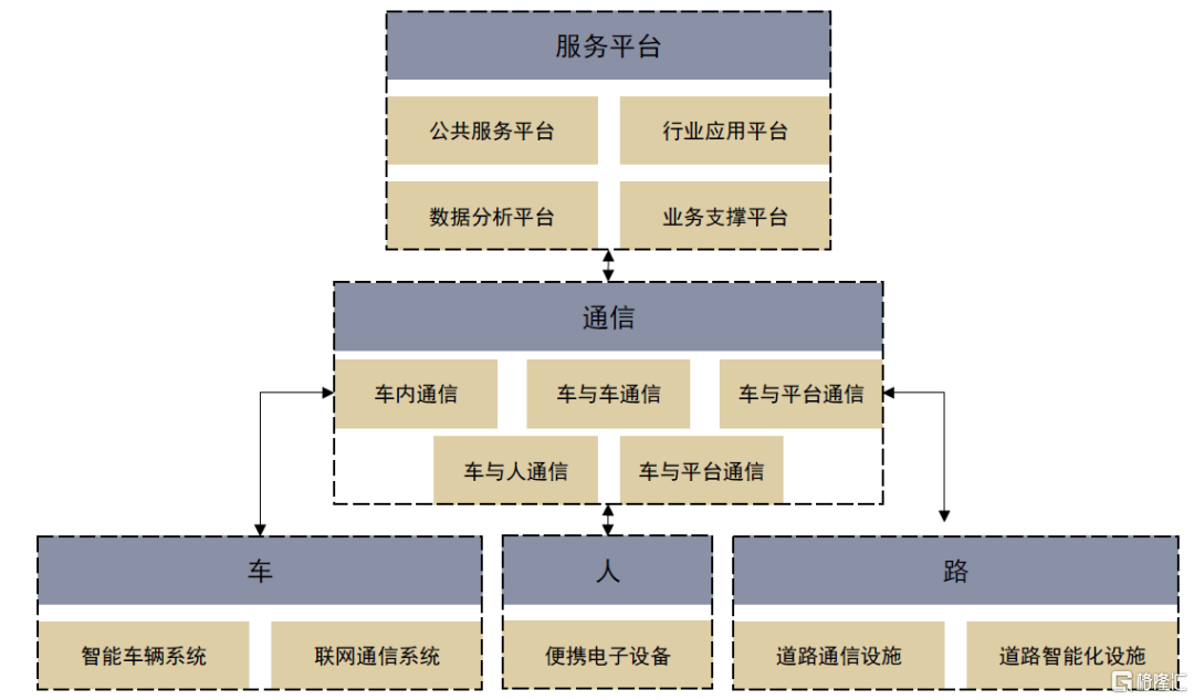 車聯網主要包含“人、車、路、通信、服務平台”五大關鍵要素。其中“人”是車聯網服務的使用者和道路環境的參與者;“車”是車聯網最核心的要素,智能網聯汽車為車聯網技術落地應用;“路”是車聯網應用的必備配套基礎設施,主要目標為實現交通道路信息化;“通信”即各類信息的交互載體,彙總傳輸車內、車路、車雲的海量信息流;“服務平台”是車聯網服務生態的業務數據載體,致力於改善用户駕乘感受。