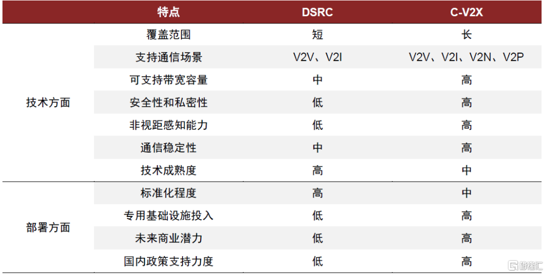 部署方面C-V2X更受國內政策和通信企業青睞:1)由於完善的移動生態系統和5G技術的成熟,C-V2X整體演進路線相比DSRC更加清晰;2)蜂窩網絡運營商可通過結合車載遠程信息服務來積極推廣C-V2X服務,快速實現C-V2X的商業化,從而可基於網絡規模效應實現控制成本和提高效益;3)C-V2X相比DSRC需求的頻譜更少。