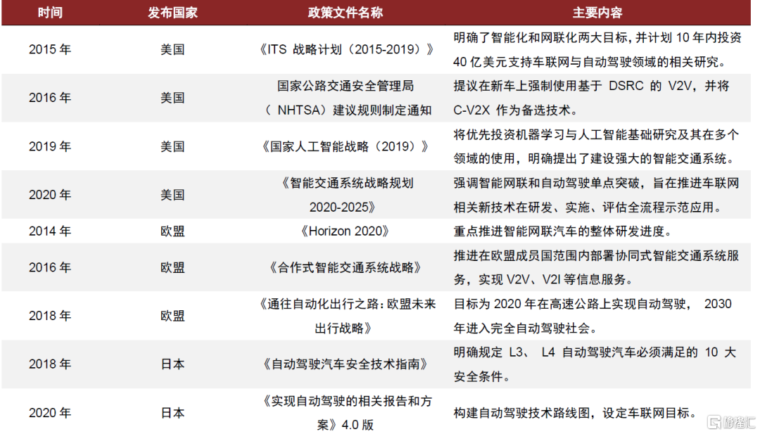 海外各國同樣重視以政策引導車聯網產業發展,但支持力度明顯不足。各國針對V2X技術路徑還有爭議,目前歐、美、日等海外國家普遍在技術路線選擇上搖擺不定,美國、日本採取技術中立態度,而歐盟則選擇混合通信方式。但汽車智能網聯化的總體綱領是各國共識,車聯網產業發展是大勢所趨。