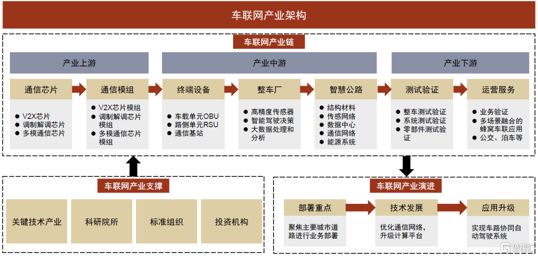 車聯網產業架構基本成型,多方支持實現技術與應用的快速升級。車聯網產業鏈主要由通信芯片、通信模組、終端設備、整車廠、智慧公路、測試驗證以及運營服務七大模塊組成。目前產業鏈各模塊已形成完整閉環,在標準組織、科研院所等相關機構的支撐下,我們認為車聯網產業將以網聯汽車為核心,聚焦於城市道路進行網絡部署和技術優化,最終實現安全、高效的車路協同系統。