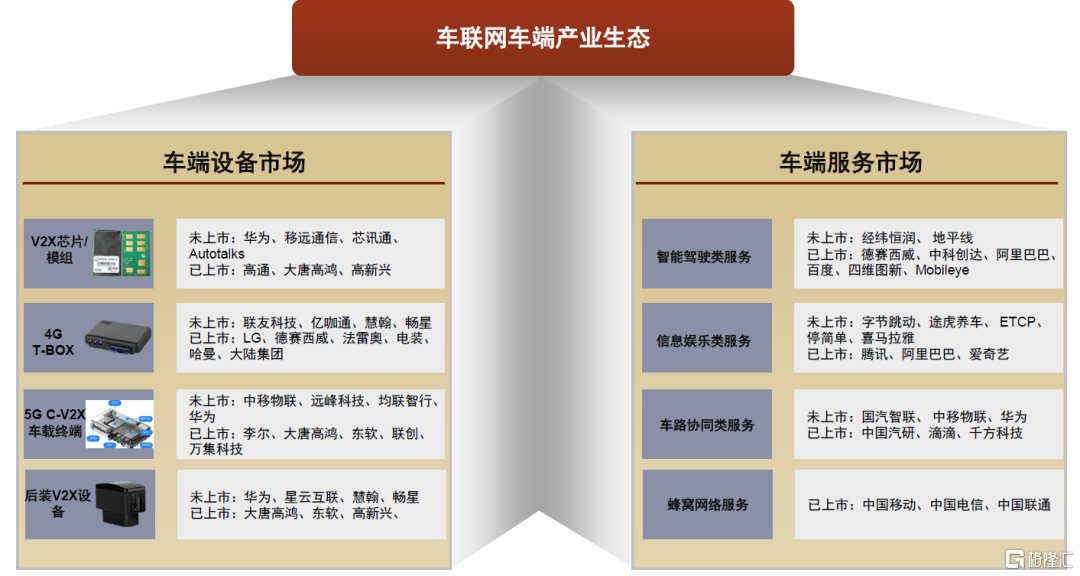 設備和服務聯合驅動V2X車端市場快速增長,車端產業生態佈局已漸趨成熟。我們將車聯網車端市場分為車載設備和內容服務兩方面進行測算。其中車載設備分為前裝集成V2X芯片的4G車載遠程信息處理器T-BOX(Telematics BOX)/5G C-V2X終端以及後裝的車載自動診斷系統OBD(On-Board Diagnostics)/定位跟蹤器等。而內容服務則包括智能駕駛類、信息娛樂類、車路協同類、蜂窩網絡四類。
