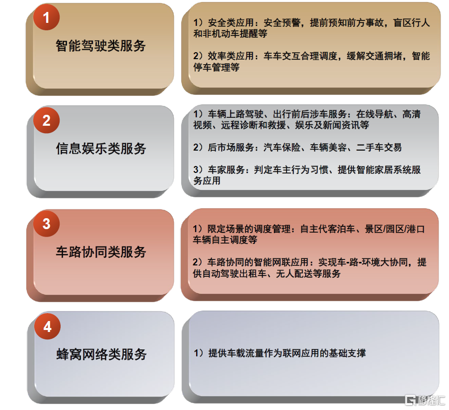 V2X車端服務種類多樣,打造安全智能的第三生活空間。其中智能駕駛類服務包括安全類和效率類應用,主要提升車輛交通智能化;信息娛樂服務則由涉車服務、後市場服務和車家服務組成,為用户提供更佳的駕乘娛樂體驗;車路協同服務則主要面向自動駕駛場景,提供限定場景的調度管理和車路協同的智能網聯應用;蜂窩網絡類服務則是基礎支撐,提供流量保障各項聯網功能正常運轉。