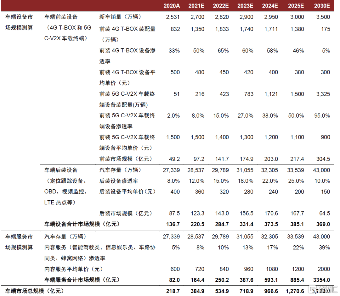 注:車端市場總規模 = 車端設備市場規模 + 車端服務市場規模 = 新車銷量 * (前裝4G T-BOX設備滲透率 * 前裝4G T-BOX設備平均單價 + 前裝5G C-V2X車載終端設備滲透率 * 前裝5G C-V2X車載終端設備平均單價) + 汽車存量 * 後裝設備滲透率 * 後裝設備平均單價) + 汽車存量 * 內容服務滲透率 * 內容服務平均單價