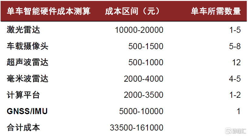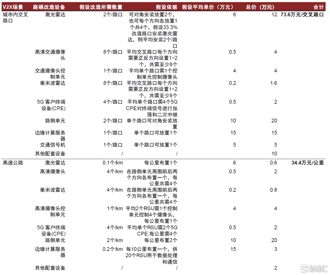 路端城市內單交叉路口改造成本約73.6萬元,高速公路前期投入約34.4萬元/公里。為滿足車聯網需求,城市內單交叉路口需改造配置激光雷達、高清攝像頭、毫米波雷達、攝像頭控制單元、圖像處理單元、路側單元、邊緣計算服務器、交通信號機及其他配套設配,根據具體測算,可預估2021至2023年單交叉路口改造成本約為73.6萬元。高速公路同樣需要以上設備,但具體佈置有所差異,我們預測2021至2023年單公里改造費用為34.4萬元。