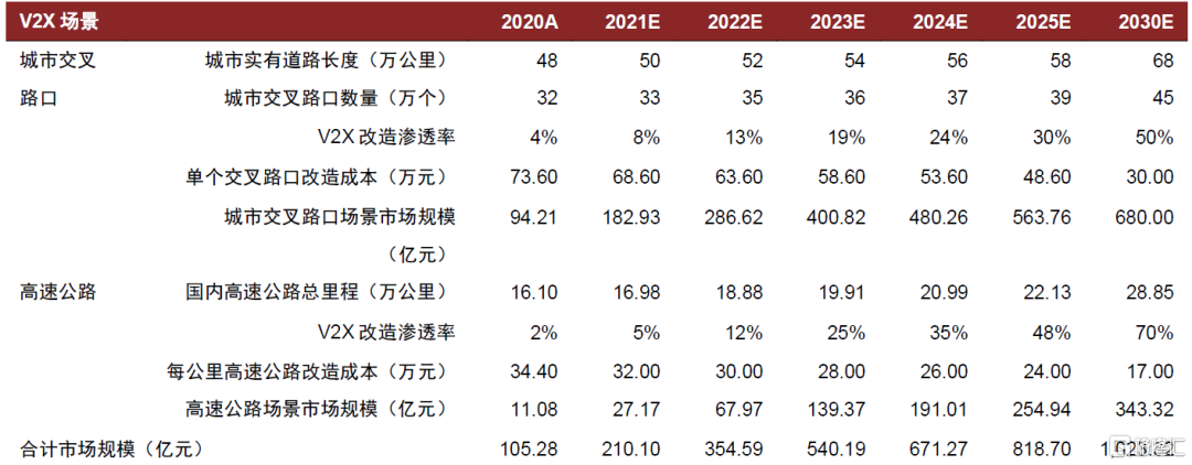 注:路端市場規模 = 城市交叉路口數量 * V2X改造滲透率 * 單個交叉路口改造成本 + 國內高速公路總里程 * V2X改造滲透率 * 每公里高速公路改造成本