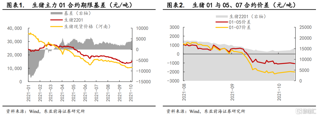 豬週期正在尋底過程中。2006年起我國豬價已經經歷了3輪完整的週期,每輪週期歷時約4年,本輪週期自2018年5月開啓了27個月的上行期,於2020年8月開始下行,持續時間達14個月。近期豬價快速下跌,截至10月8日,全國22省市仔豬與生豬平均價分別爲23.77元/公斤與10.78元/公斤,養殖利潤進入深度虧損區。截至10月11日,主力合約LH2201對河南地區現貨價升水4585元/噸,較前一交易日走強910元,主力01合約對遠月05合約平均貼水1075元/噸,價差較前期走擴。