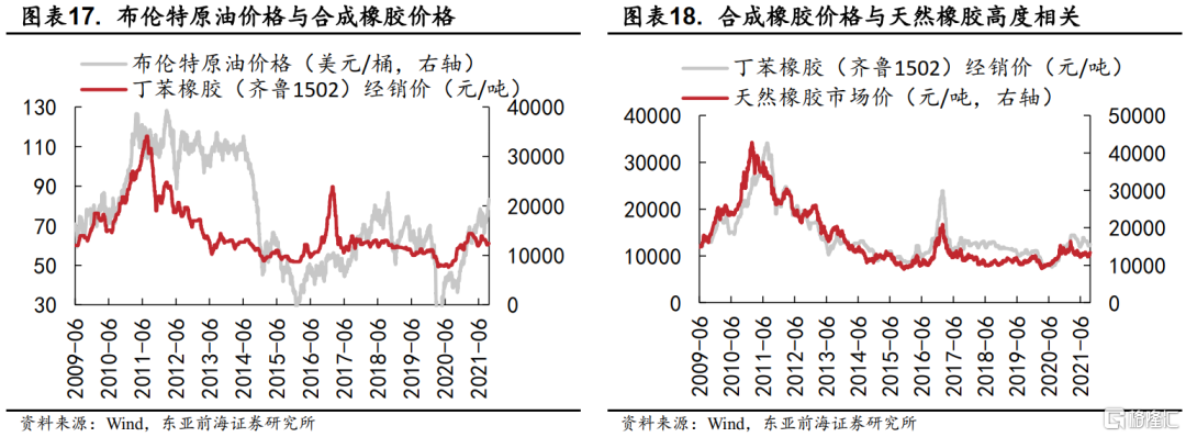 3)合成橡膠對其替代品天然橡膠的價格傳導。合成橡膠以二烯烴和烯烴爲單體聚合而成的高分子材料,以石油、天然氣爲原材料。當原油、天然氣價格上漲時,合成橡膠成本會顯著上行,進而推高合成橡膠價格。橡膠行業的下遊輪胎等製造商往往根據兩者的價差來確定最終產成品中兩類橡膠的使用比例,因而合成橡膠的價格上漲往往也會帶來對天然橡膠的需求增加,進而通過替代效應完成對天然橡膠的價格傳導。