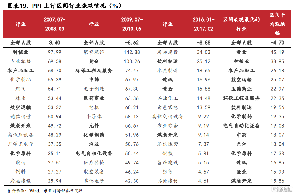 我們回顧了歷史上PPI的回升階段A股的市場行情,整體來看,週期性行業受益最大。申萬二級行業中,黃金、種植業、農產品加工業等行業在過去三個PPI上行區間內表現最好。