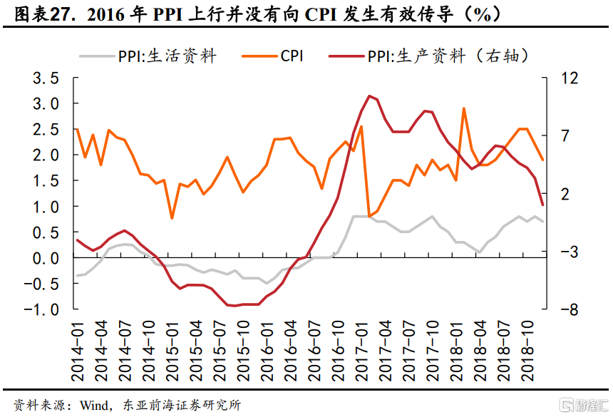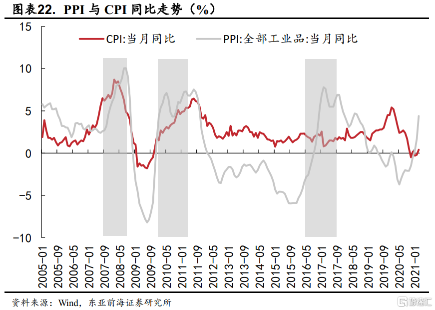在三輪國際大宗商品上漲行情中,國內市場的工業品價格均出現了上漲,但節奏與之並不完全一致。而從對消費品價格的傳導來看,2007-08年與2010-11年間均出現了通貨膨脹的快速上行,而2016-17年間PPI向CPI的傳導則相對不暢,大宗商品價格的上漲並不必然驅動國內物價水平的上行。