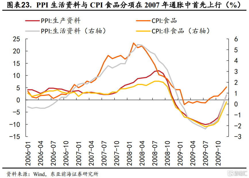 2007年7月-2008年8月期間,PPI從低點2.40%上行至10.06%,持續了13個月。在此輪PPI上行之前,國內過熱的經濟已經顯著推動了通脹上行。此前貨幣寬鬆下過剩流動性的累積首先從CPI的食品分項和PPI生活資料端推動通脹,而在產出缺口走闊的需求端拉動下PPI生產資料端的上行相對滯後,而海外大宗商品的價格上漲也助推了本輪的漲幅。此輪通脹中,CPI領先PPI上行2個月。