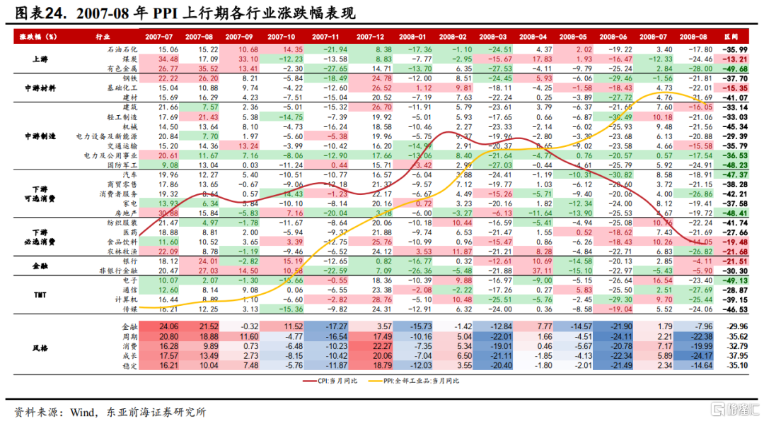 這一階段,A股受次貸危機影響,股價全線下跌。。從2007年7月-2008年8月,上遊板塊中煤炭下跌較少爲-13%,石油石化、有色金屬下跌幅度較大,分別達到了-35.99%、-13.21%、-49.68%。中遊材料中,基礎化工下跌較少,爲15.35%。整體來,看金融危機前週期品行業漲勢良好,金融危機後周期品單月跌幅居前情況較多。製造板塊跌幅居中,僅公用事業下跌幅度較大,連續13個月變動幅度位居全行業末5位,區間跌幅達到-36.75%。
