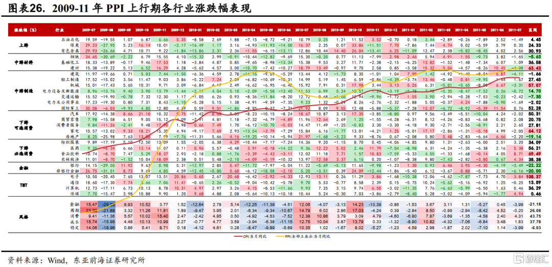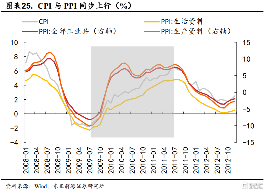 2009年7月-2011年7月期間,PPI從低點-8.20%快速上行至7.54%,持續了24個月。本輪PPI下行中經濟處於衰退週期,GDP增速快速回落,一方面,國內天量信貸釋放了大量流動性;另一方面,次貸危機後,國際經濟復甦疊加寬鬆的流動性也推動了大宗商品的大幅上行。這一階段,流動性寬鬆主導下CPI與PPI出現了同步上行的特徵。