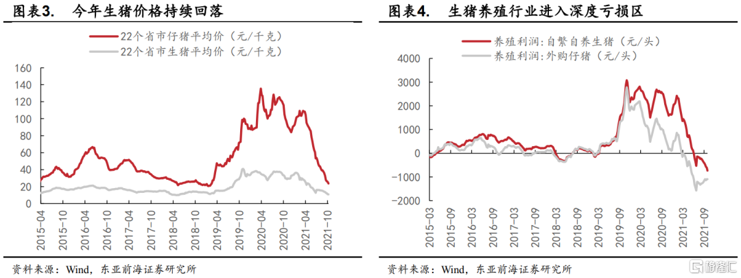 產能持續去化、季節性消費回暖疊加收儲政策預期,豬肉價格有望企穩。近期豬價快速下跌,截至10月8日,全國22省市仔豬與生豬平均價分別爲23.77元/公斤與10.78元/公斤,養殖利潤進入深度虧損區。從供給來看,當前生豬供給相對充足,不過養殖戶在持續虧損背景下育肥意願低迷,農業農村部數據顯示7-8月能繁母豬存欄量總量穩定(領先生豬供應約10個月)但環比分別下降0.5%和0.9%,結束了連續21個月的增長,表明此輪行業產能去化開啓。從需求來看,10月10日商務部會同國家發展改革委、財政部等部門收儲3萬噸中央儲備豬肉,收儲量較前幾輪明顯增多,推動10月11日生豬期貨主力上漲。隨着四季度豬肉消費進入旺季,中央和地方二輪收儲的陸續開展有助於穩定市場情緒,豬肉價格有望在四季度企穩。