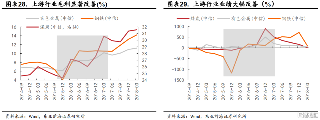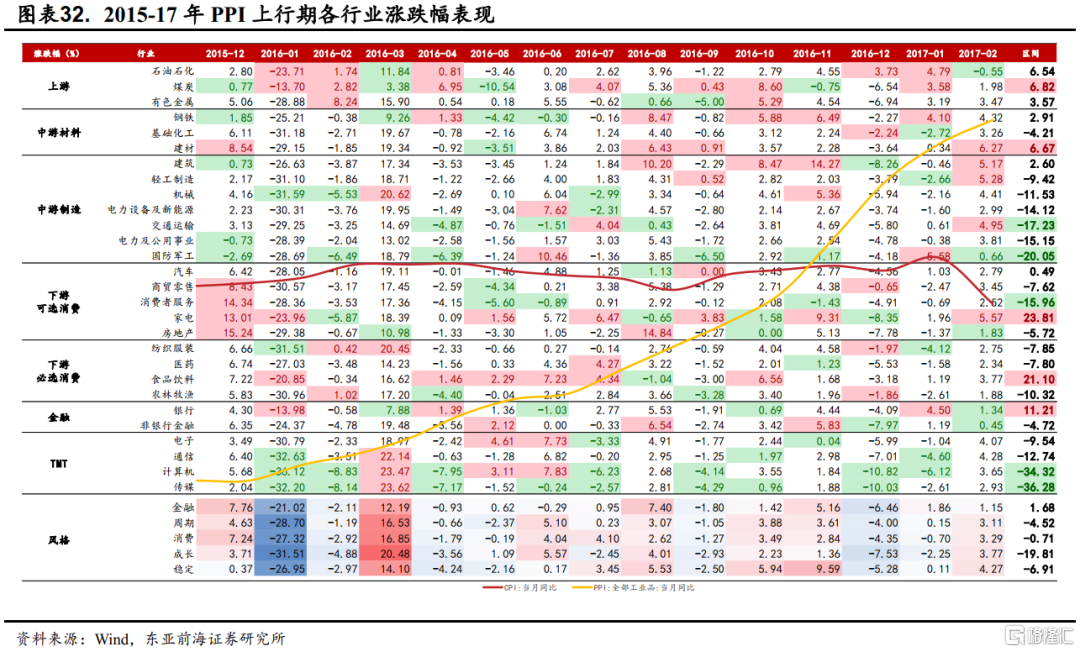 這一階段,A股中信一級行業中,上遊整體表現良好。從2015年12月-2017年2月,石油石化、煤炭和有色金屬區間漲跌幅分別爲6.54%、6.82%、3.57%,其中煤炭和石油石化分別由有8個月和5個月單月漲幅位列全行業前5;中遊材料中,鋼鐵、建材表現良好,漲幅分別爲2.91%和6.67%。受上遊成本對盈利的擠壓,中下遊行業普遍下跌,僅家電和食品飲料逆勢上行。
