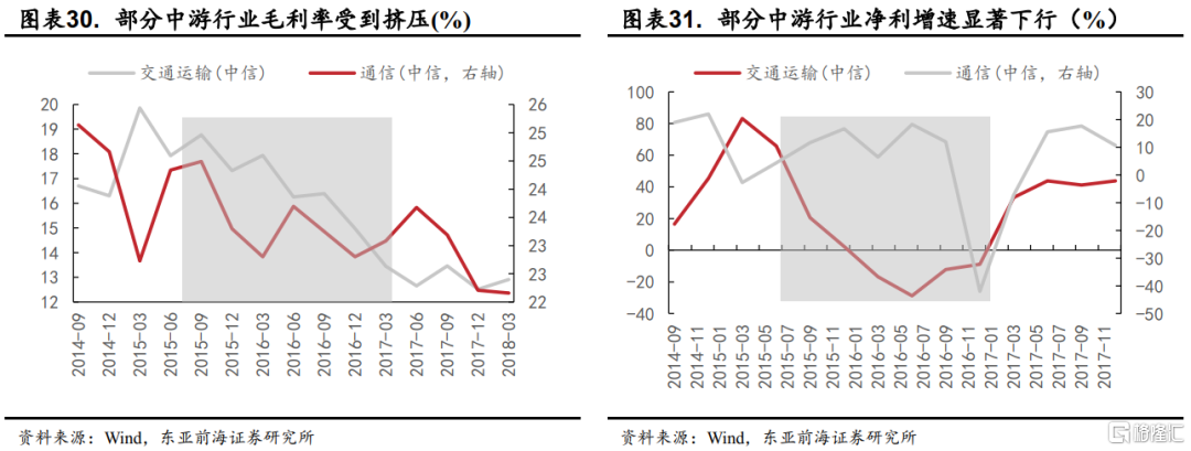 由於價格傳導的不暢,部分中遊企業的盈利受到了擠壓。以煤炭、鋼鐵、有色爲代表的上遊行業在供給側改革過剩產能降低的推動下毛利與業績均大幅改善,而中遊部分議價能力較弱的行業則無法將價格向下遊進行有效傳導,以交通運輸和通信爲代表的行業在毛利擠壓下業績增速顯著下行。