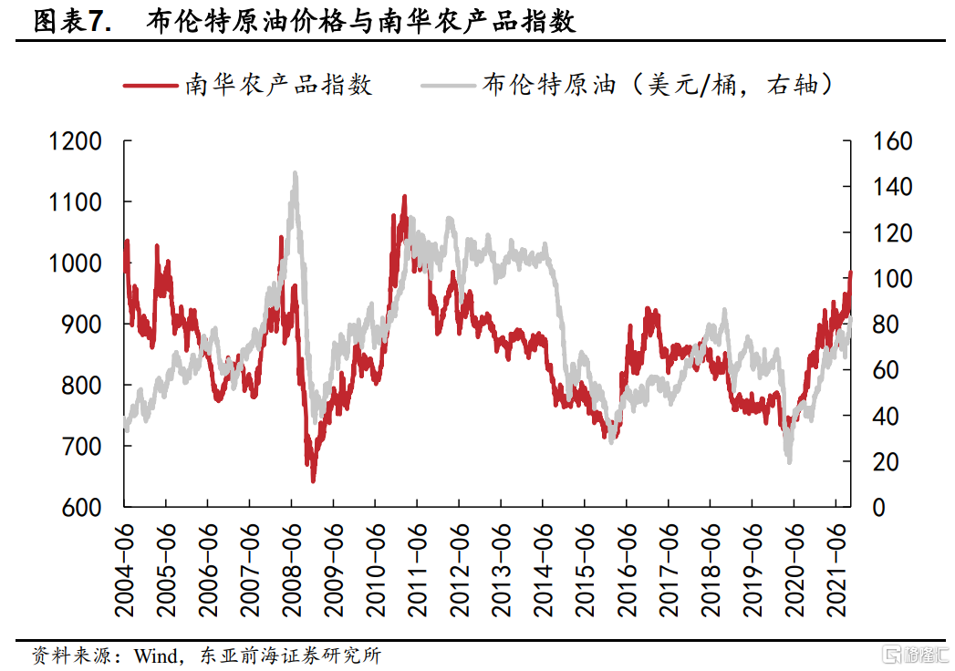 隨着全球能源危機逐步向包括印度、巴西在內的新興市場蔓延,海外類滯脹壓力正在逐步顯現。能源價格快速上漲從成本推動與替代效應兩方面帶動農產品價格提升。從歷史上來看,原油價格上漲對農產品價格有着較爲顯著的傳導,2004年以來布倫特原油價格在2007年、2010年、2016年和今年的快速上行均顯著推高了南華農產品指數。