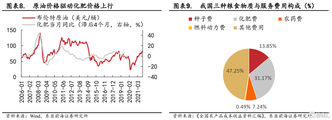 一是從成本驅動角度來看,原油價格上漲推高化肥等農產品成本,進而驅動水稻、小麥、玉米等主糧價格上漲;由於化肥生產依賴於煤、油、氣等化石能源,化肥價格在原油價格上行階段會出現較爲明顯的反應。從領先滯後關係來看,布倫特原油價格大致領先化肥價格3-4個月,化肥價格的上漲也將有力推高主糧的生產成本。