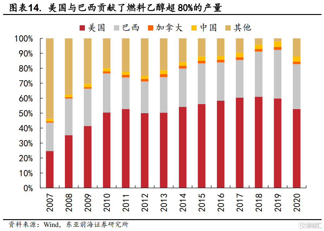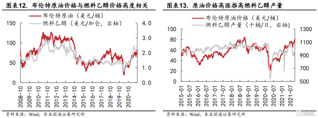 1)燃料油替代品燃料乙醇對玉米、甘蔗及食糖的價格傳導。從2008年以來價格走勢來看,布倫特原油價格與燃料乙醇價格高度相關,原油價格高企會推動燃料乙醇擴張產能。當前燃料乙醇的生產主要依賴美國與巴西,兩國2020年佔全球產量比重分別高達52.72%和30.02%。美國的燃料乙醇主要通過玉米生產,而巴西則主要通過甘蔗,受乾旱等極端天氣的極端天氣困擾,巴西甘蔗歉收,而燃料乙醇推動的需求上升將進一步影響食糖價格。