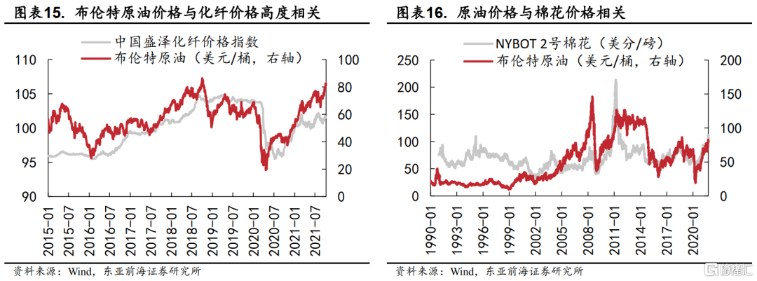 2)化纖替代品棉織品對棉花的價格傳導。化纖生產中主要原料之一化工產品PTA與原油價格高度相關,帶來了油價向化纖價格的傳導。而一旦化纖價格過高,則棉織品的替代效應將逐步顯現,此時市場對於棉花的需求增加將進一步推高棉花的價格。