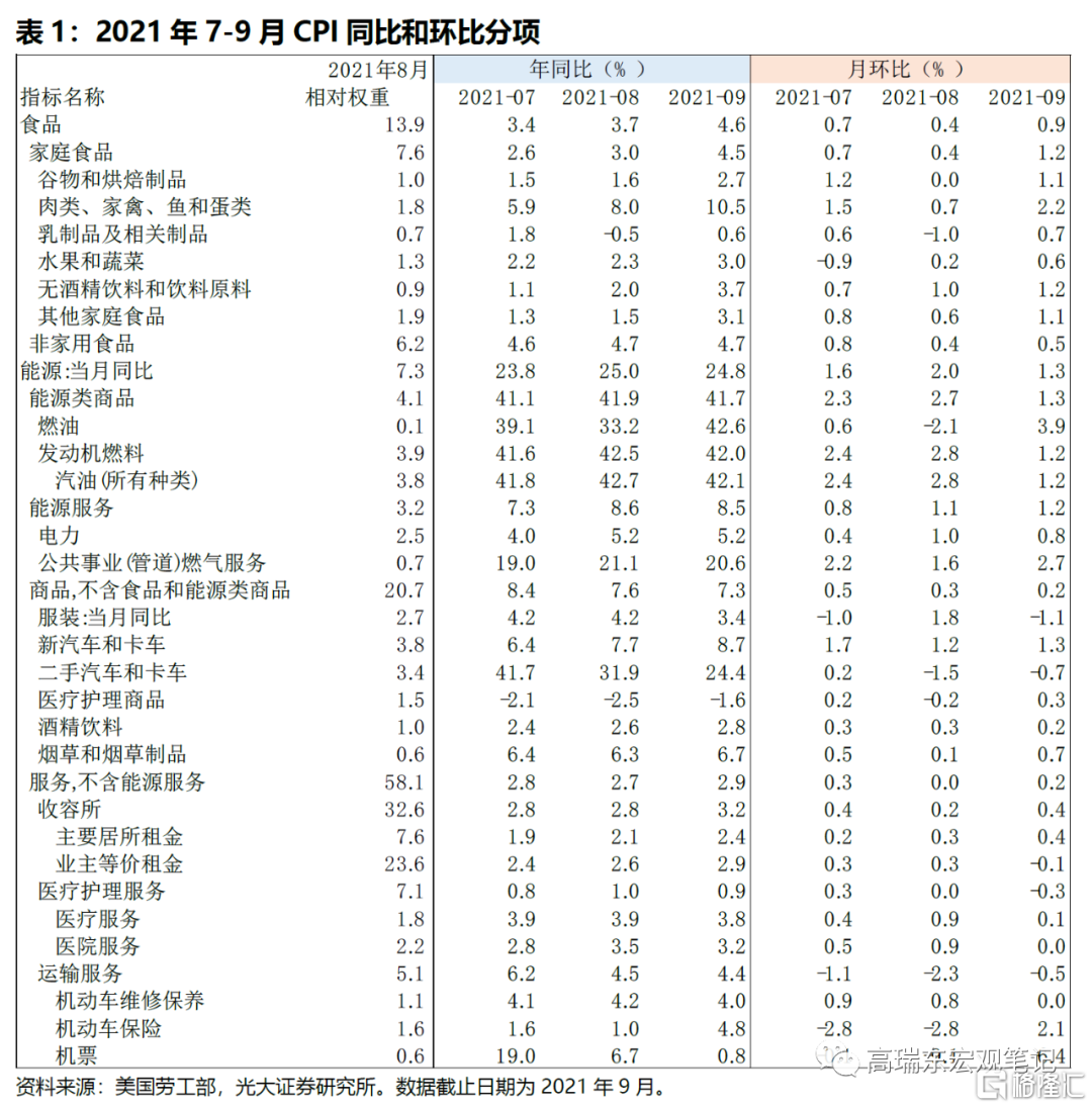 1)美國9月CPI同比增5.4%, 前值5.3%,市場預期5.3%;CPI環比增0.4%,前值0.3%,市場預期0.3%;