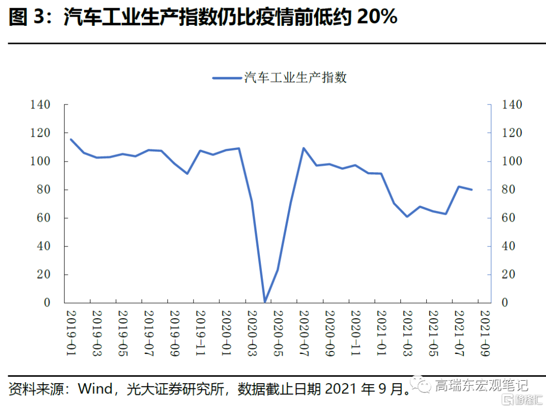 受供應鏈緊縮影響,9月新車價格延續上漲態勢,環比升1.3%,同比升8.7%。一方面,芯片短缺疊加交付時間延長限制汽車產量,擡升價格。8月美國汽車工業生產指數爲80,仍比疫情前低20%,顯示汽車產量受限,拖累汽車供給。