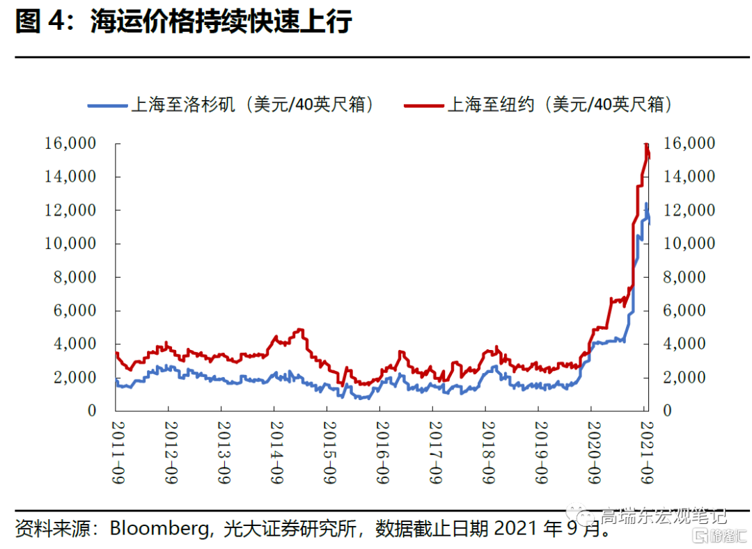 一方面,港口堵塞導致船舶停擺,進一步導致船舶緊缺。另一方面,集裝箱貨船極度短缺造成運費快速上行,10月WCI上海到洛杉磯和紐約的集裝箱貨運基準費率同比已分別上行175%和211%。