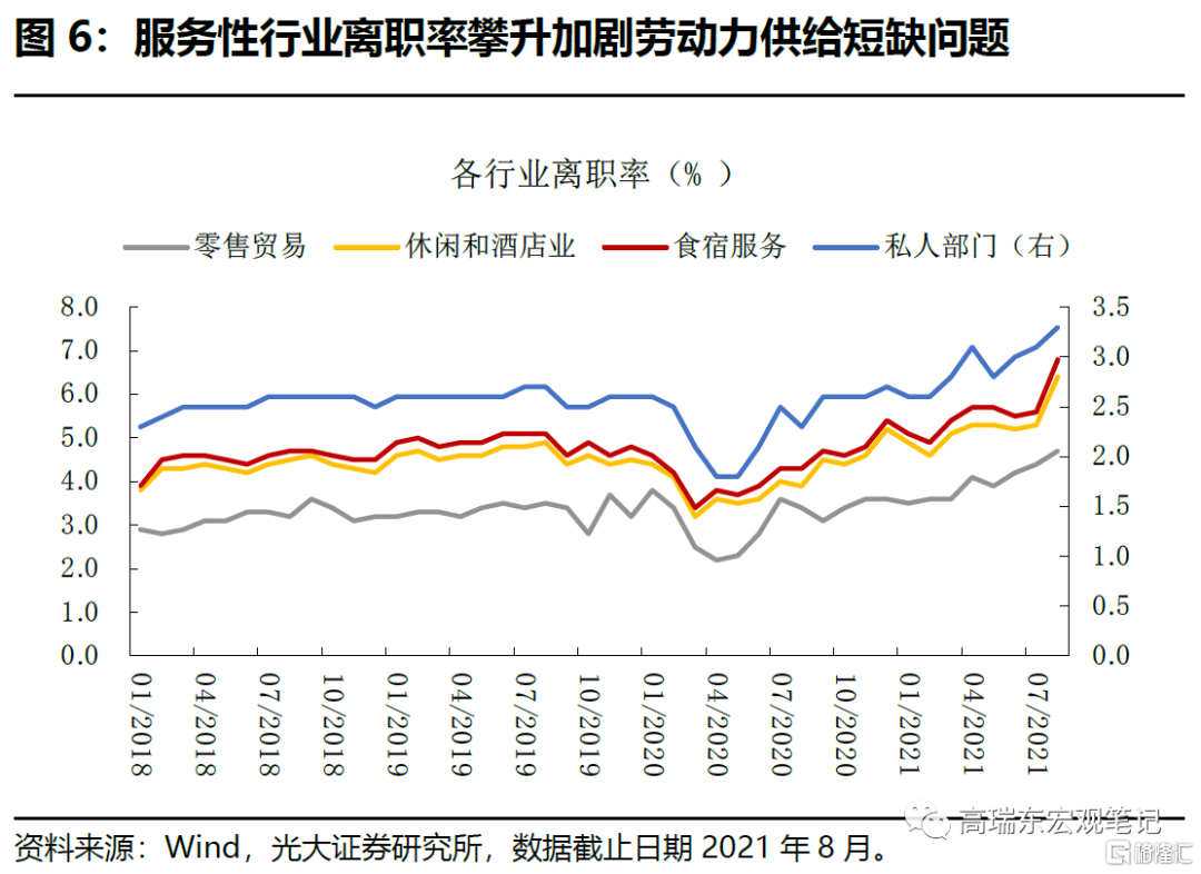 9月非家用食品(外出餐飲)價格環比上漲0.5%,連續第5個月上行,預計勞動力短缺將持續帶動服務性行業消費價格上漲。從非農時薪增速的角度可以看到,美國勞動力市場供不應求。一方面,美國勞工部10月12日發佈的一組數據顯示,截至8月底,有1040萬個職位空缺,遠超8月總體失業的770萬人,顯示勞動力市場供需嚴重不平衡。