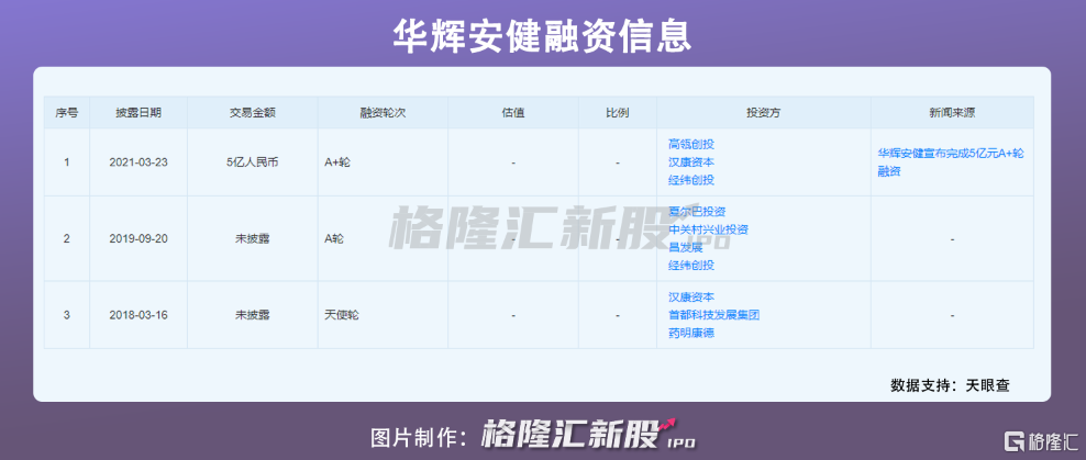 據格隆匯新股瞭解,華輝安健(北京)生物科技有限公司(以下簡稱“華輝安健”)日前宣佈已於今年3月23日完成5億元A+輪融資。本輪融資由高瓴創投領投,老股東漢康資本、經緯創投等機構繼續加碼。