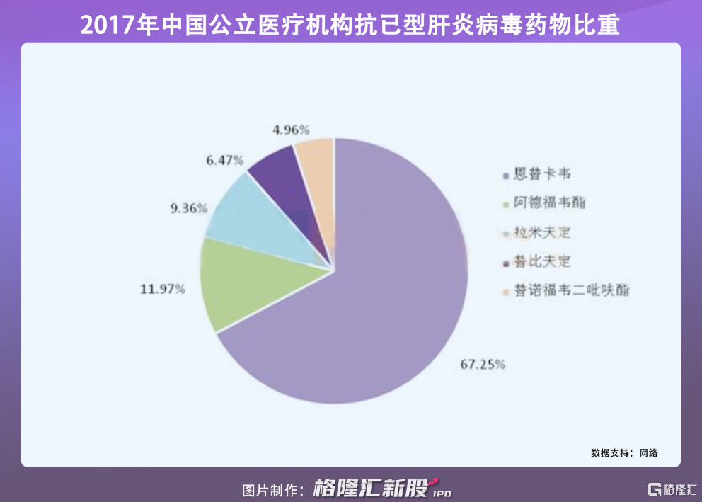 而目前,恩替卡韋佔據主要市場,是各國治療慢性乙型肝炎一線藥物,具有抗病毒效果好、安全性高、低耐藥的特點,也是國內公立醫院抗乙肝病毒藥物市場佔有率第一,2017年達到67%。