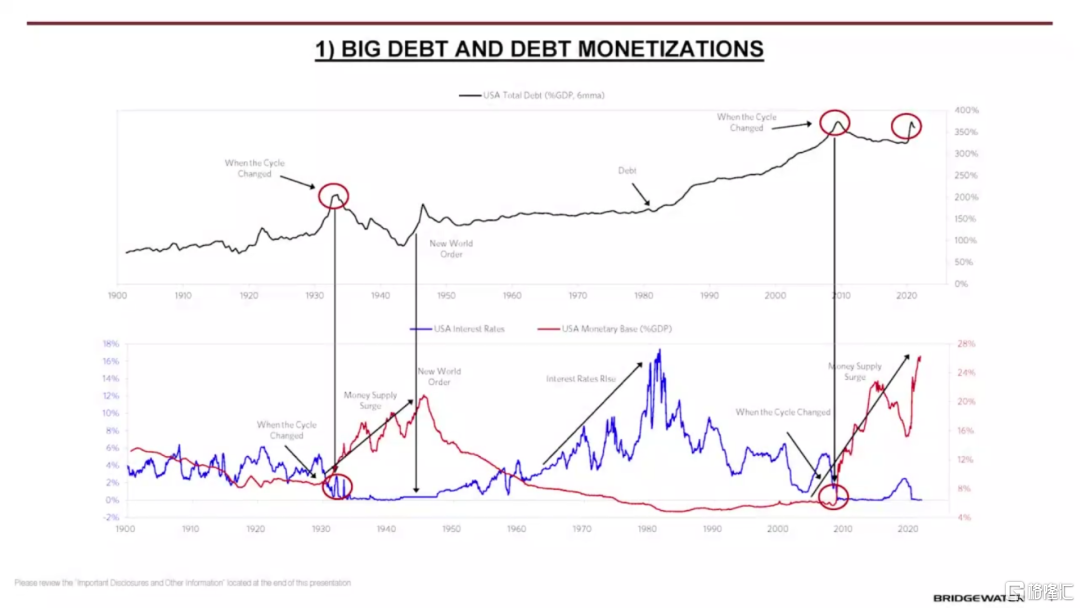 圖1 1900年以來美國債務水平、利率和貨幣發行量