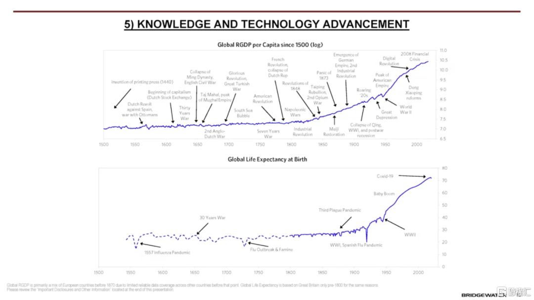 第五股力量是知識和技術的進步,這種進步不斷地提高着人類的生活水平。達利歐認爲,與發明創造和技術發展的影響相比,前四種力量的影響都極爲有限。