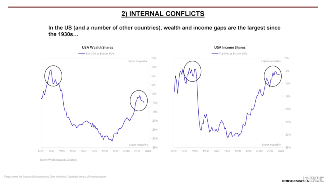 最終,債務和經濟問題出現,伴隨着巨大的財富差距和機會差距,這通常會導致左派和右派之間的巨大內部衝突。如果在發生這些巨大沖突的時候,國內領導人的力量不夠強大,內部衝突可能會演變成內戰,並導致該國貨幣喪失作爲儲備貨幣的地位。