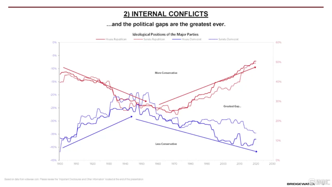 第二股力量是本就巨大且不斷增長的財富鴻溝和價值觀鴻溝,其導致各國內部發生社會衝突,體現爲政治立場的極端化、左派和右派之間的鬥爭。數據顯示,當前美國國內的財富差距、收入差距以及兩黨的政治立場差異均達到歷史高點。