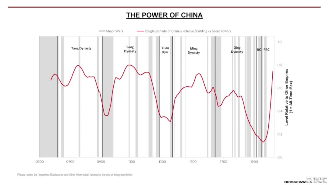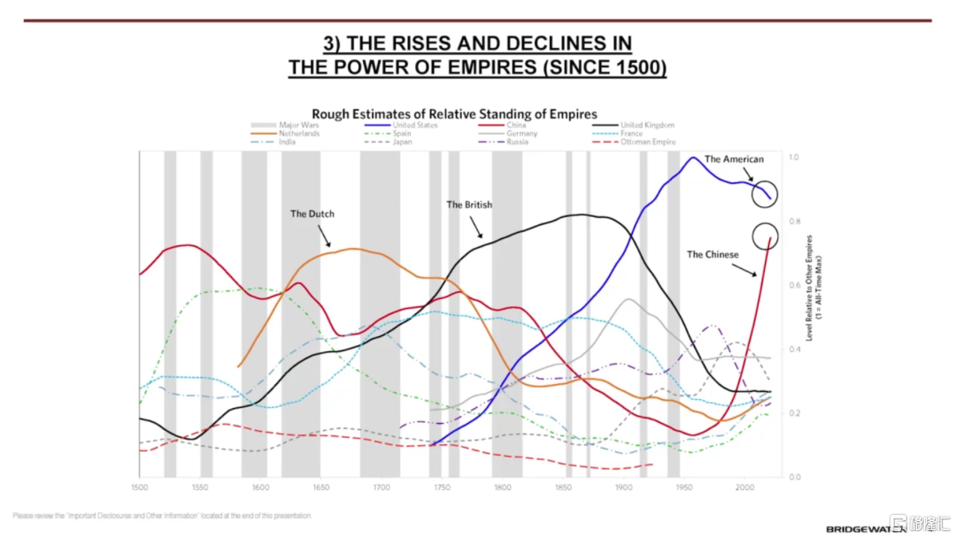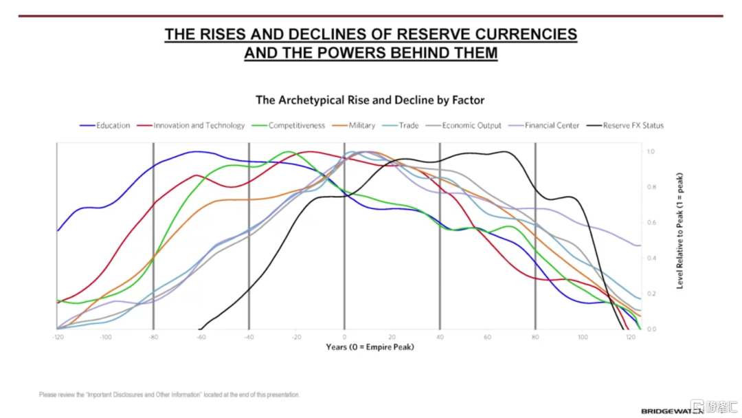 剛纔我提到並展示的反映各大國家相對權力上升下降的實力指數,由八個不同的子指數組成,通過繪製各個國家子指數的平均值,我可以預判哪些國家領先、哪些國家落後,從而瞭解國家及其貨幣的興衰。