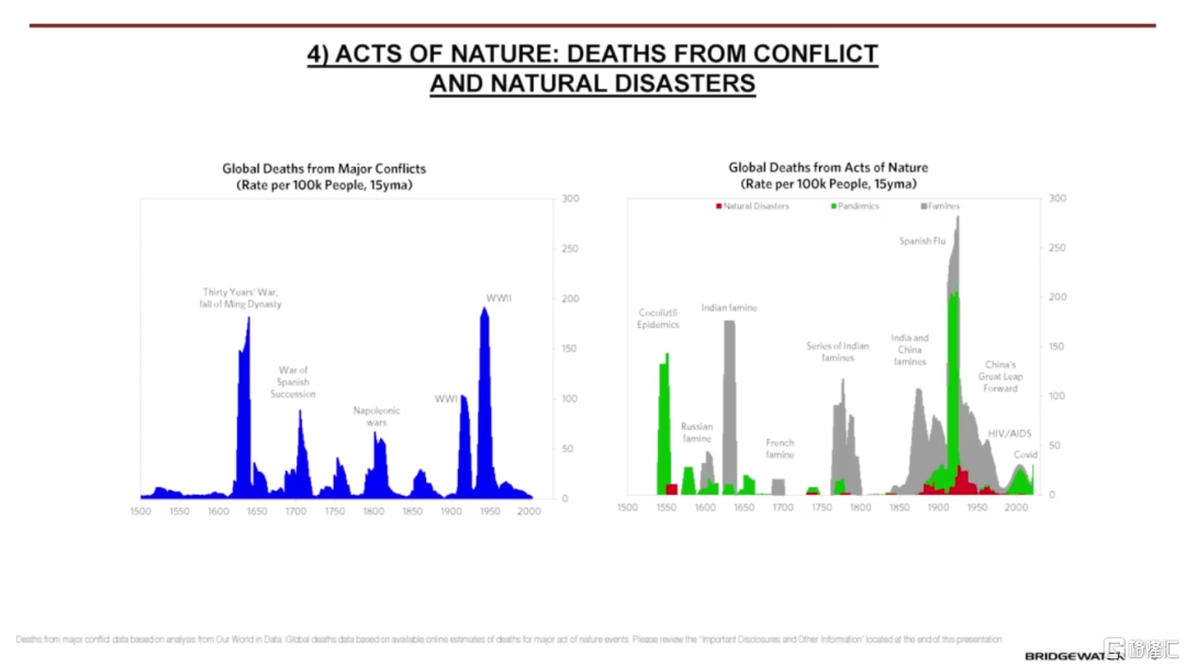 其一就是排名第四的自然因素,其中最重要的就是大流行病、乾旱和洪水。這些因素造成的死亡人數要多於戰爭,是改變國內和世界秩序的巨大力量。