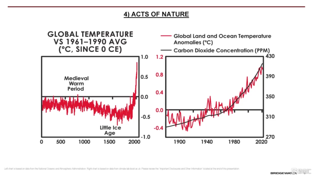 至於第四大力量,也就是自然因素的影響,我們當然不能忽視氣候變化。圖9顯示了溫度的變化,其中左圖是自公元元年以來,右圖是自1900年以來。氣候因素肯定會對未來產生重大影響。
