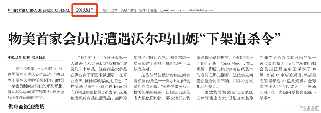 2015年就有媒體報道,物美遭山姆“下架追殺令”