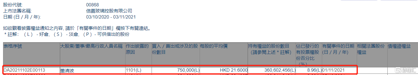 格隆匯APP獲悉,根據聯交所最新權益披露資料顯示,2021年11月1日,信義玻璃(00868.HK)獲執行董事兼副主席董清波在場內以每股均價21.60港元增持75萬股,涉資約1620萬港元。
